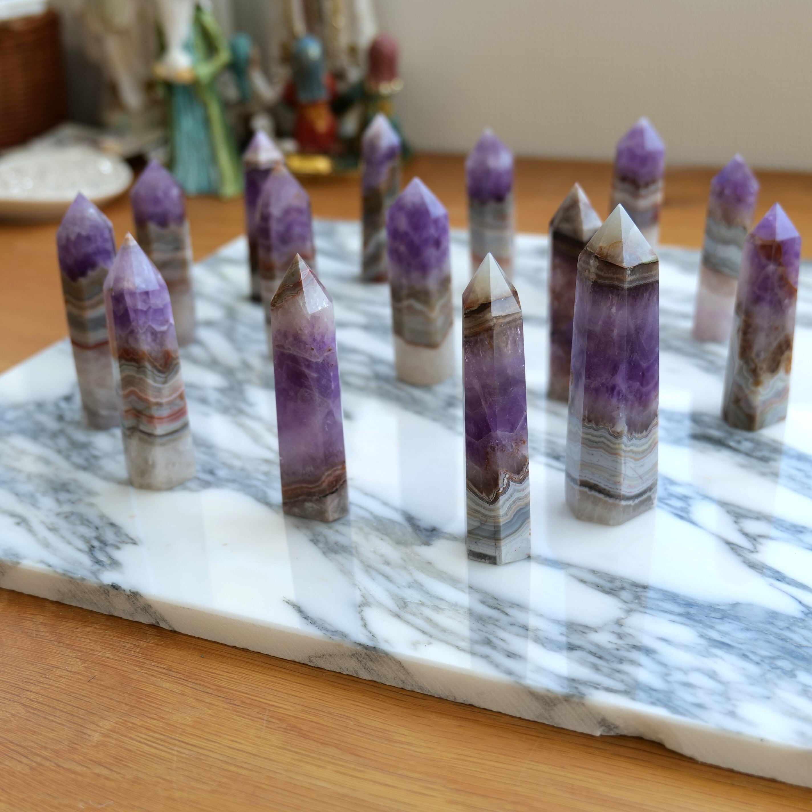 アメジストの神秘的な紫の輝きと、アゲート(瑪瑙)の調和の力が融合した、美しいポイント状の天然石。