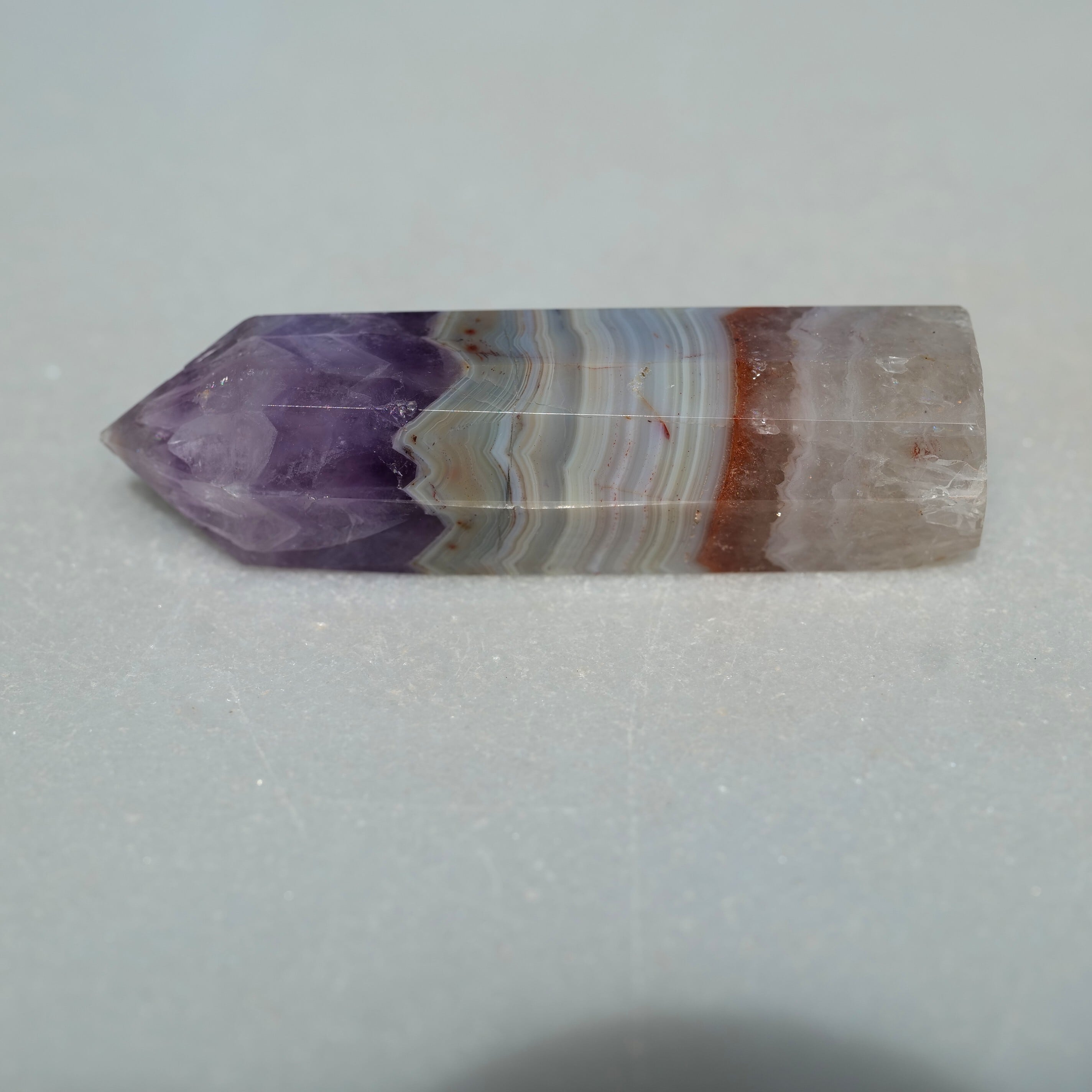 アメジストの神秘的な紫の輝きと、アゲート(瑪瑙)の調和の力が融合した、美しいポイント状の天然石。