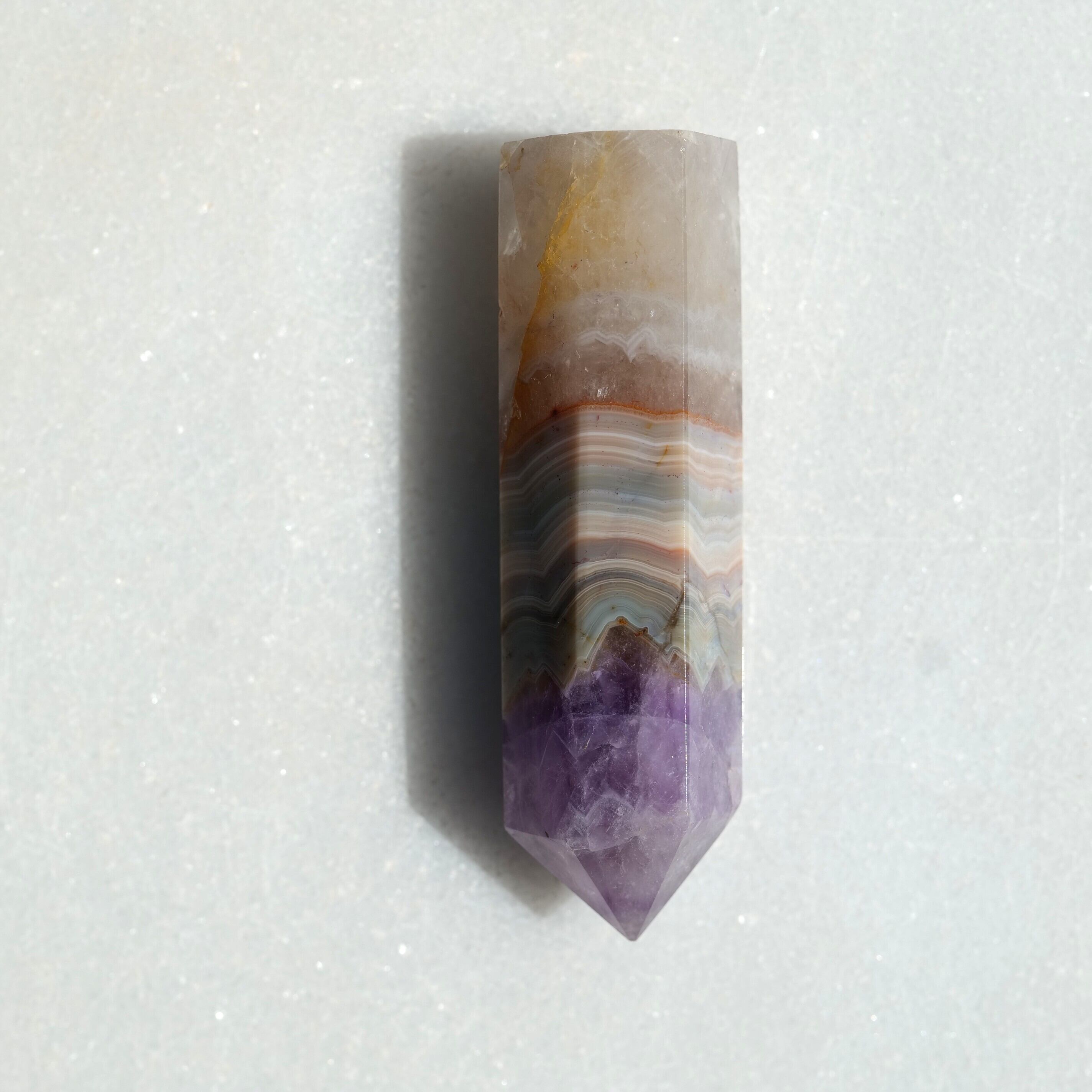 アメジストの神秘的な紫の輝きと、アゲート(瑪瑙)の調和の力が融合した、美しいポイント状の天然石。