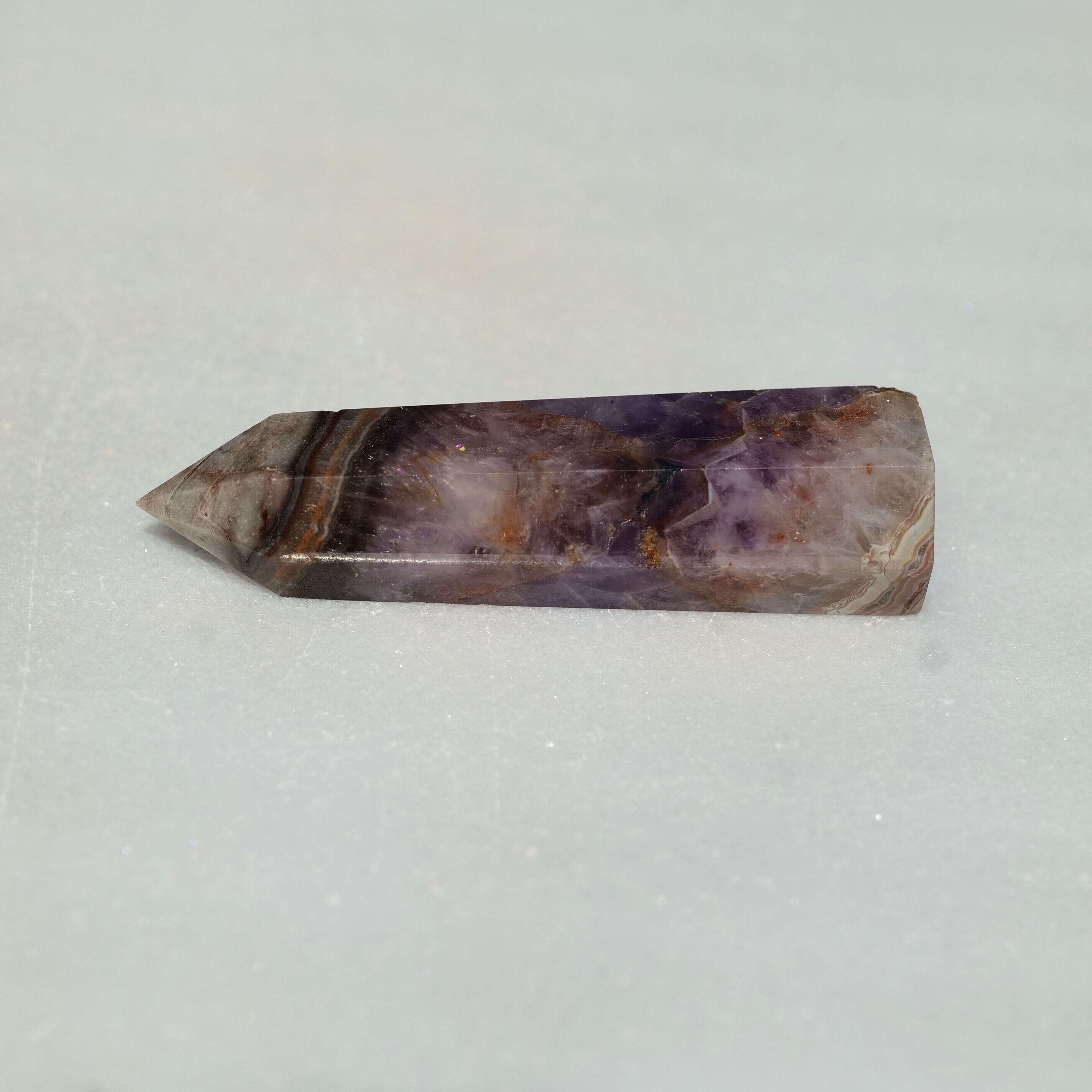 アメジストの神秘的な紫の輝きと、アゲート(瑪瑙)の調和の力が融合した、美しいポイント状の天然石。