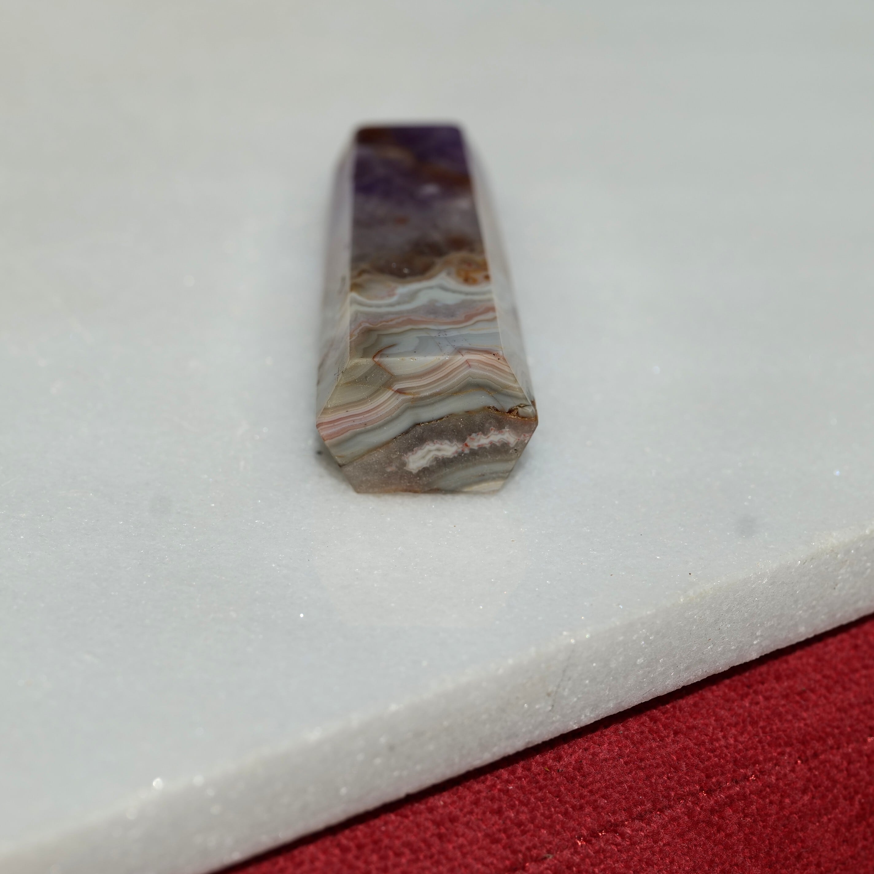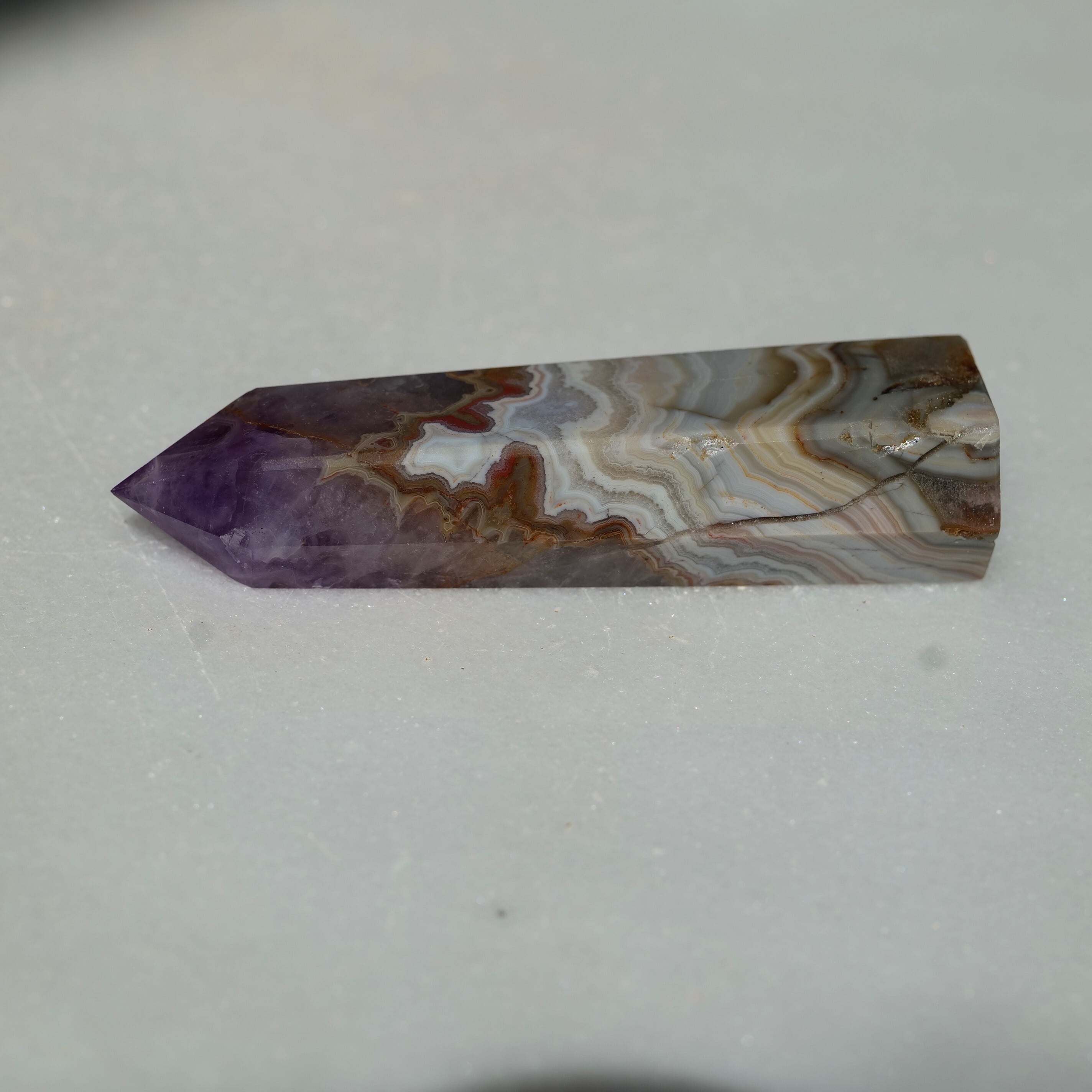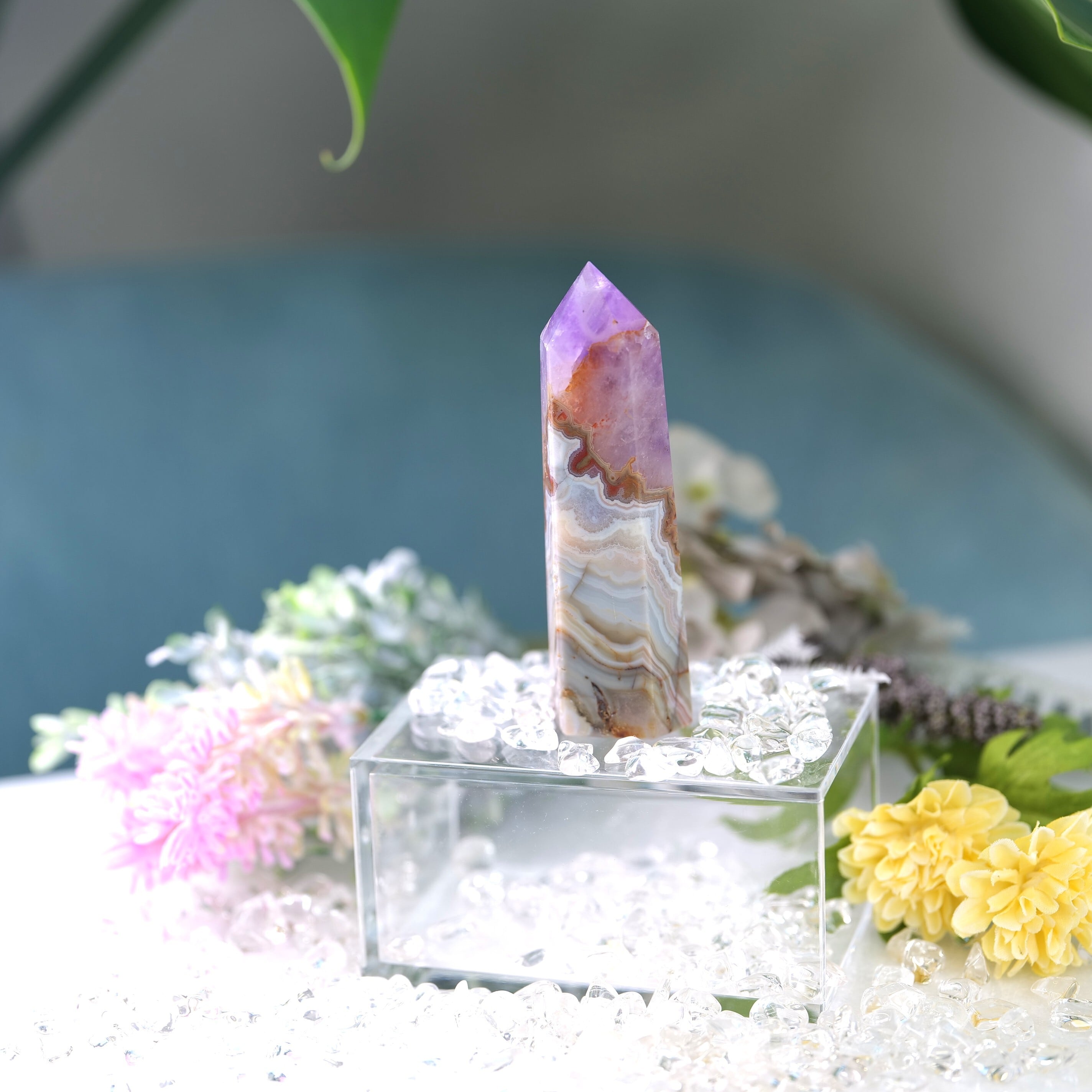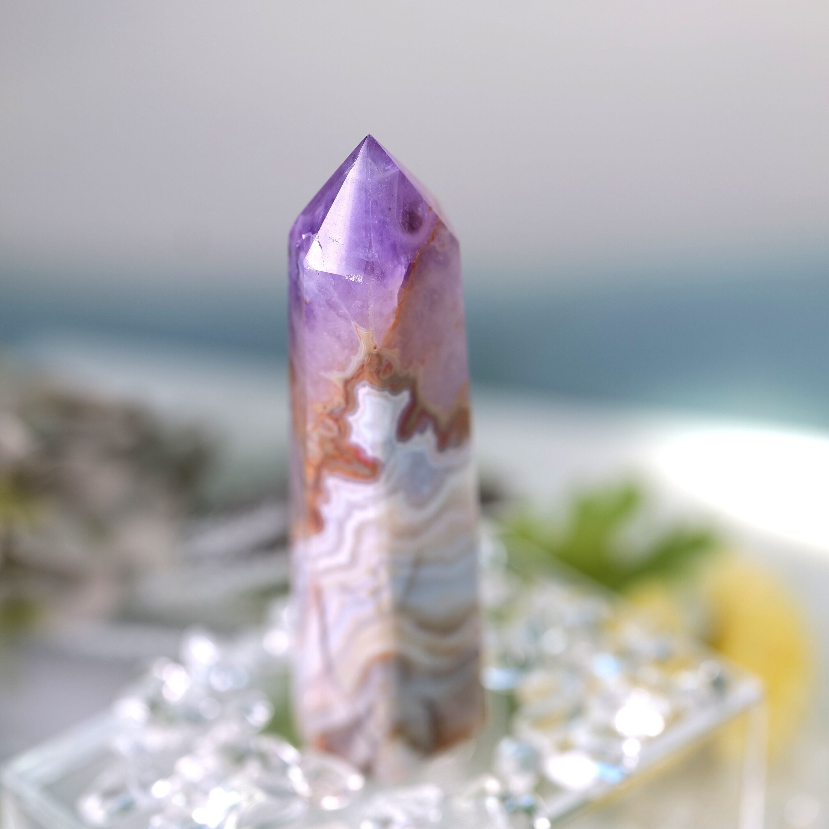 アメジストの神秘的な紫の輝きと、アゲート(瑪瑙)の調和の力が融合した、美しいポイント状の天然石。