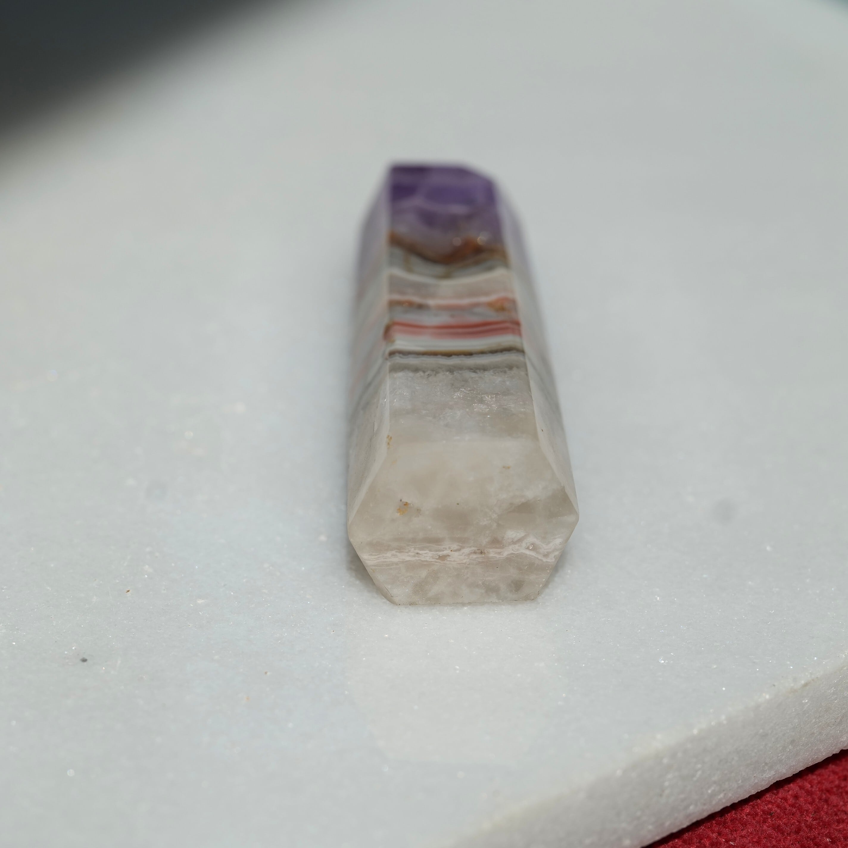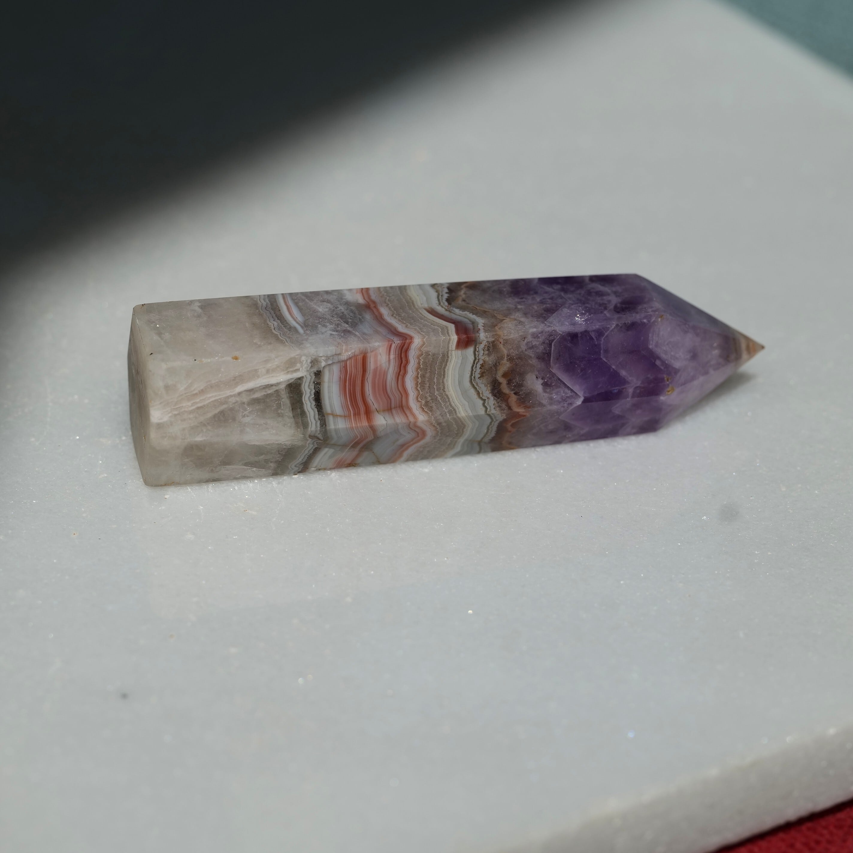 アメジストの神秘的な紫の輝きと、アゲート(瑪瑙)の調和の力が融合した、美しいポイント状の天然石。