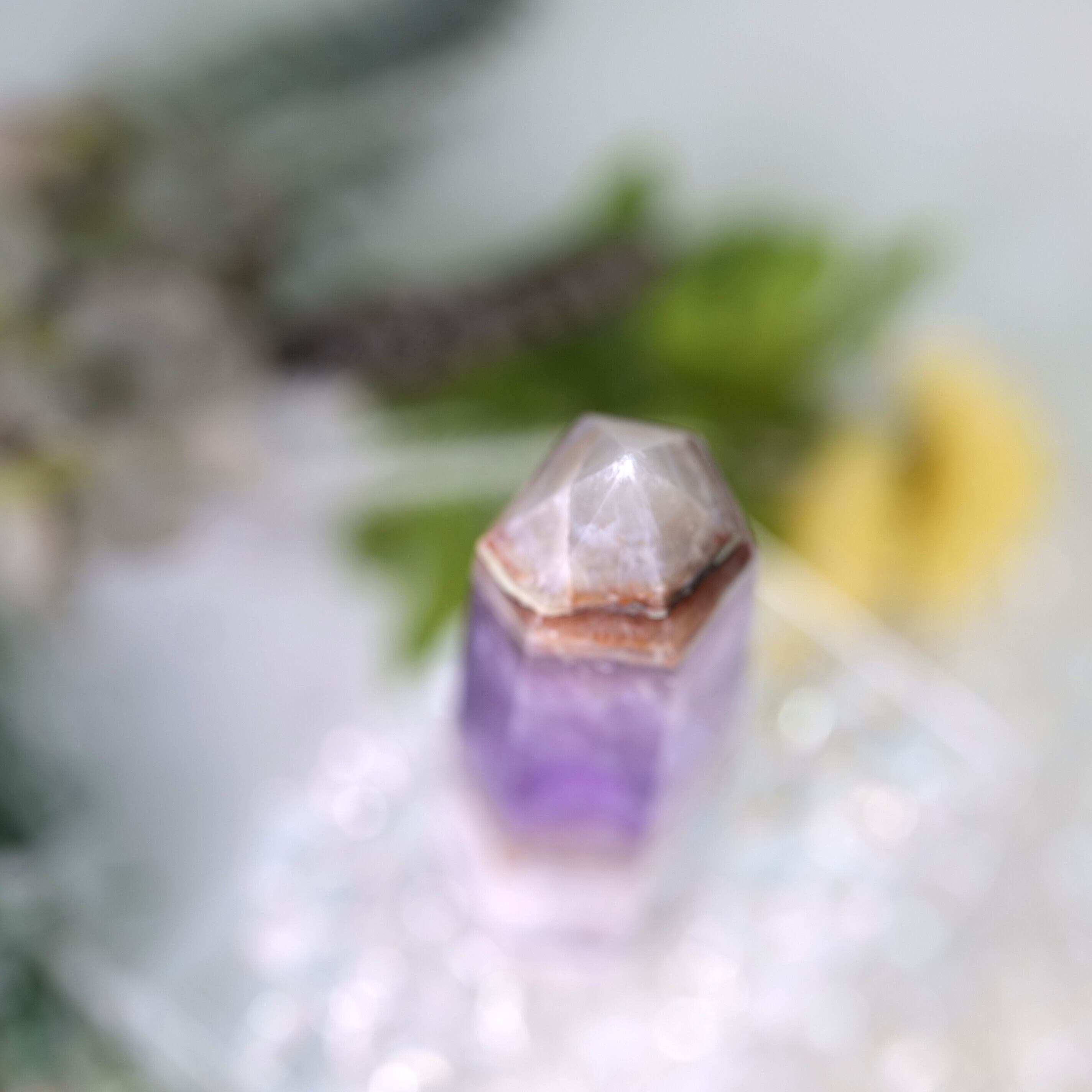 アメジストの神秘的な紫の輝きと、アゲート(瑪瑙)の調和の力が融合した、美しいポイント状の天然石。
