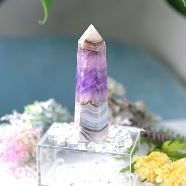 アメジストの神秘的な紫の輝きと、アゲート(瑪瑙)の調和の力が融合した、美しいポイント状の天然石。