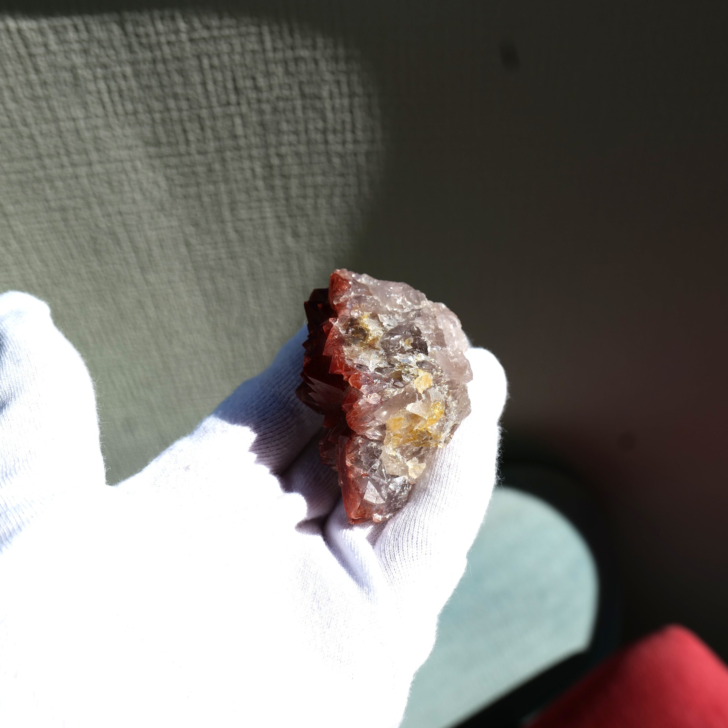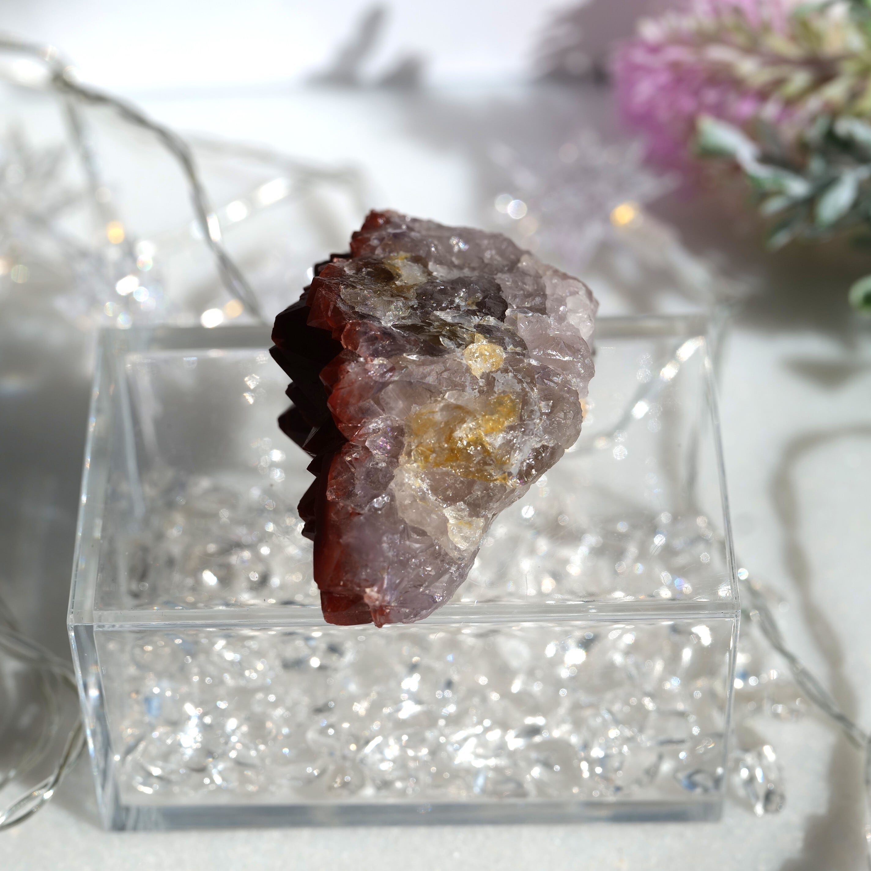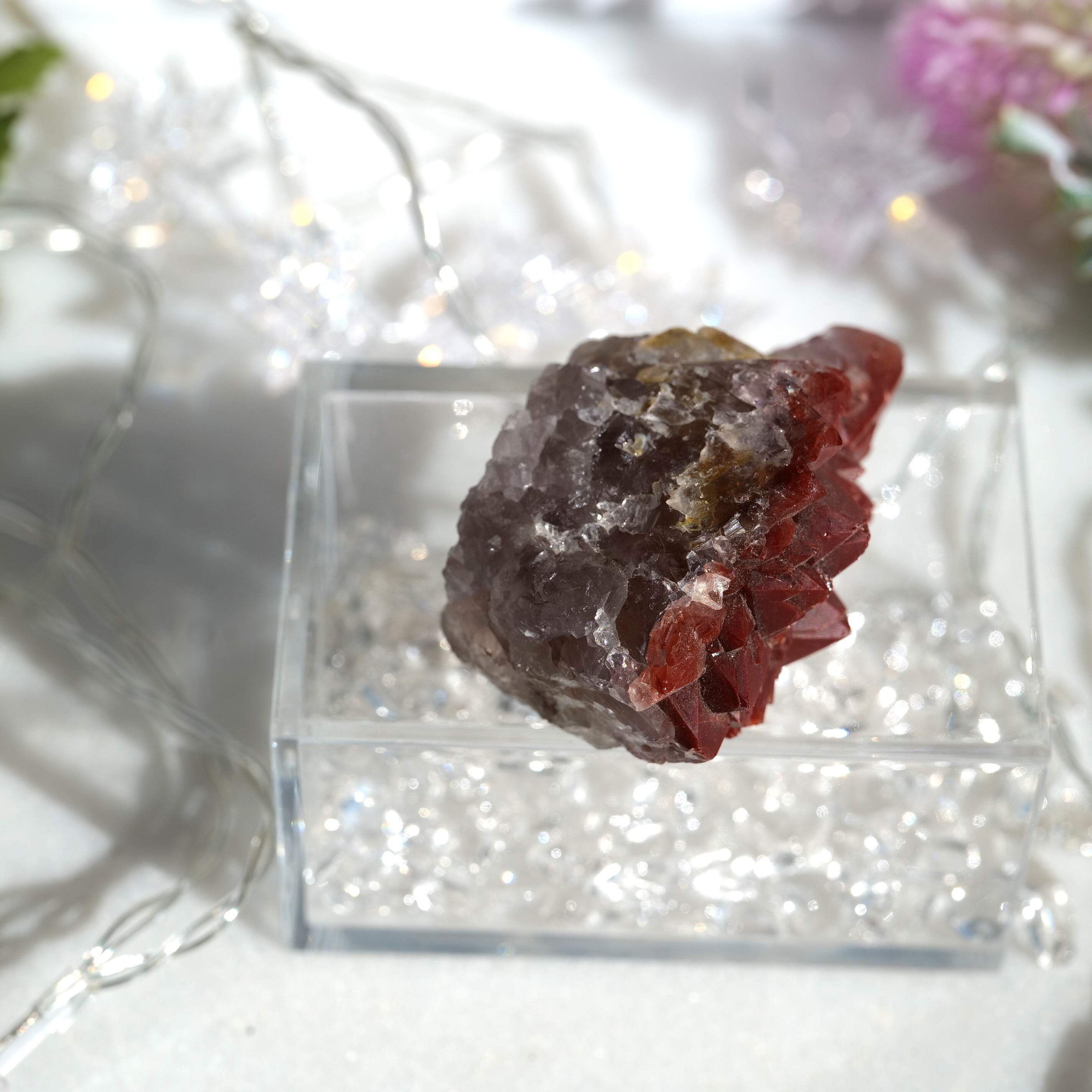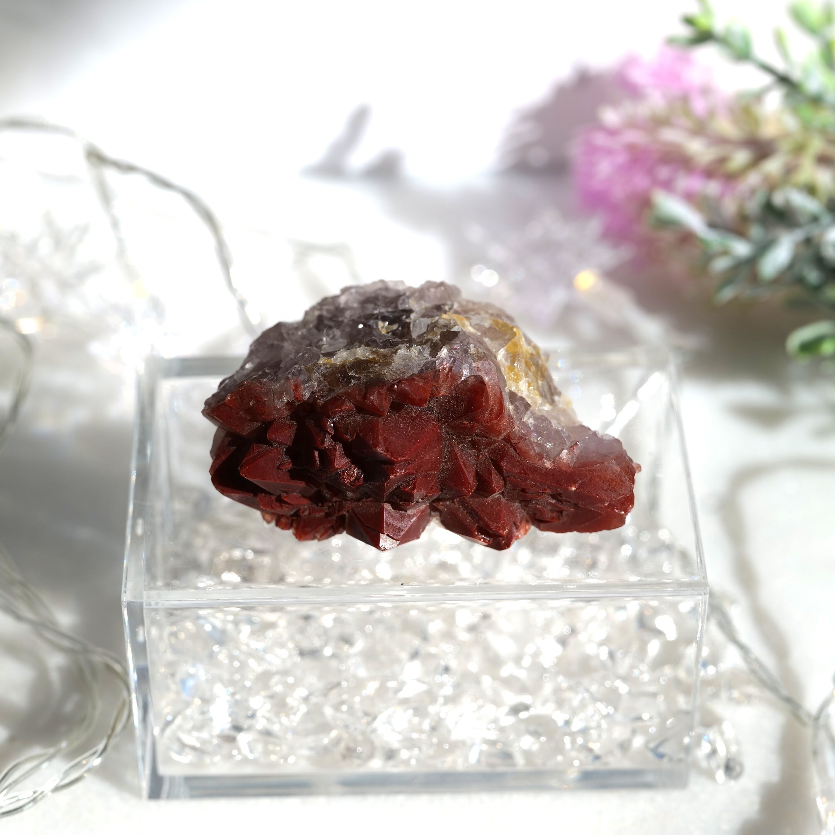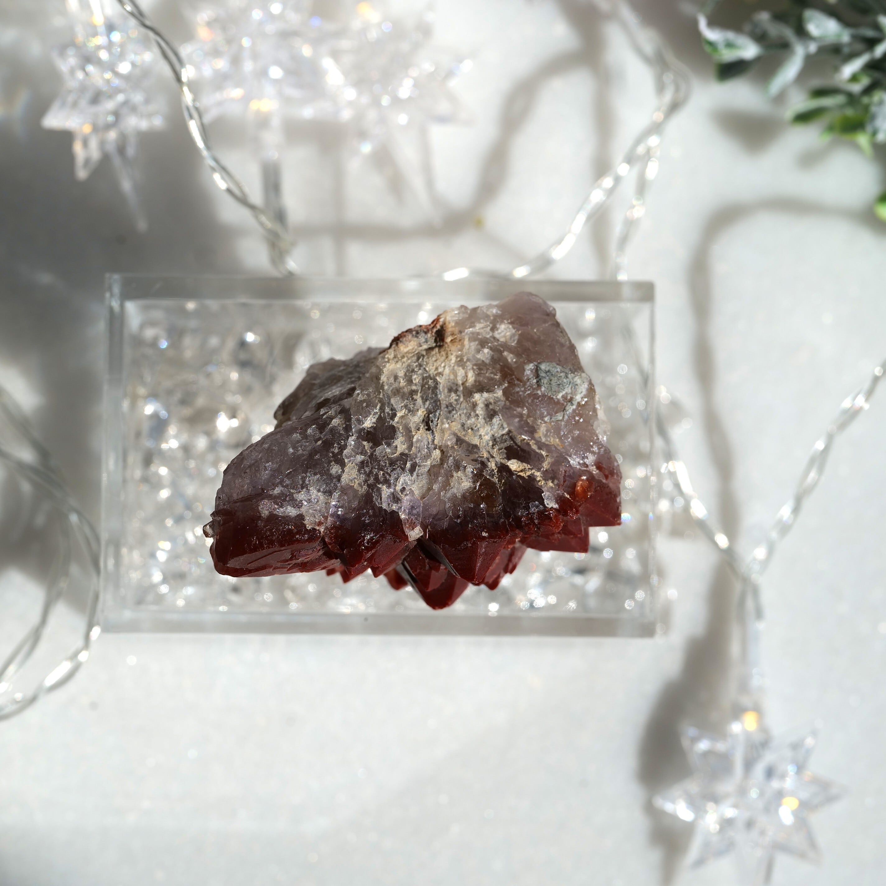 結晶の先端部に赤~赤褐色の酸化鉄を内包し、