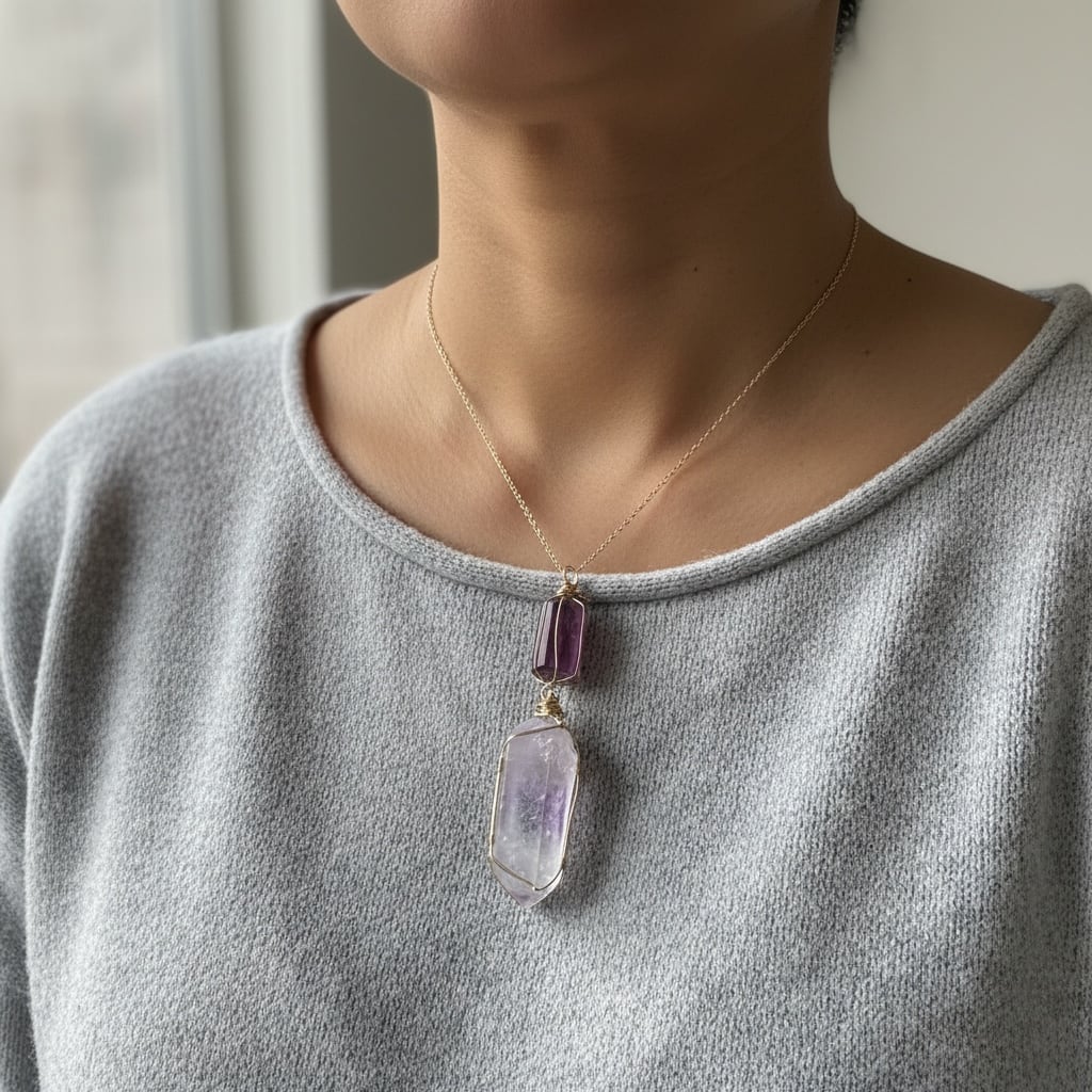 このジュエリーはこのアメジスト部分はハートチャクラにはっきりとした働きかけをしていきます