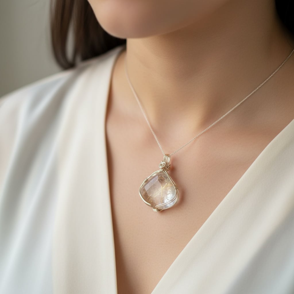 水晶の中に針状のルチル(金紅石)を内包した希少な石。