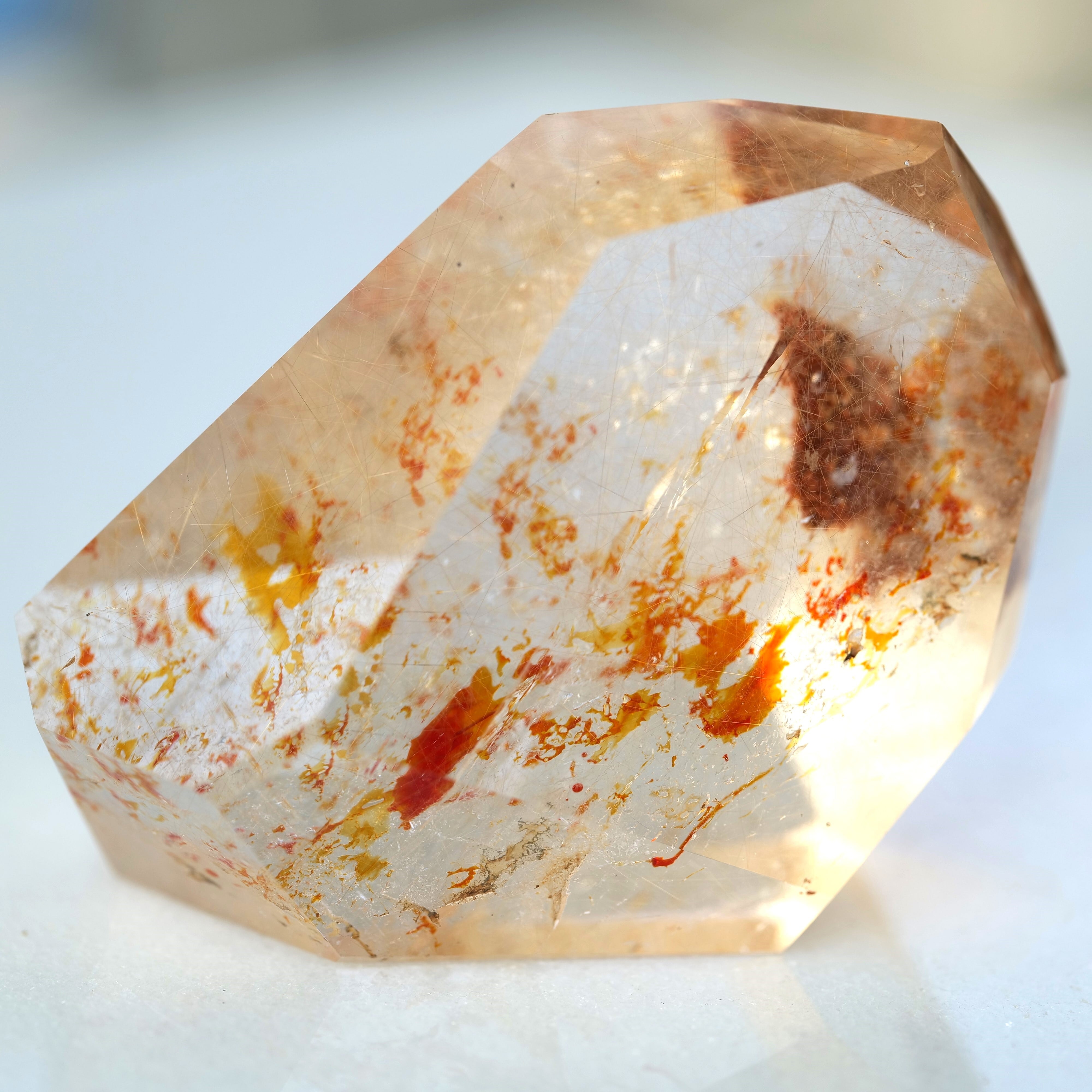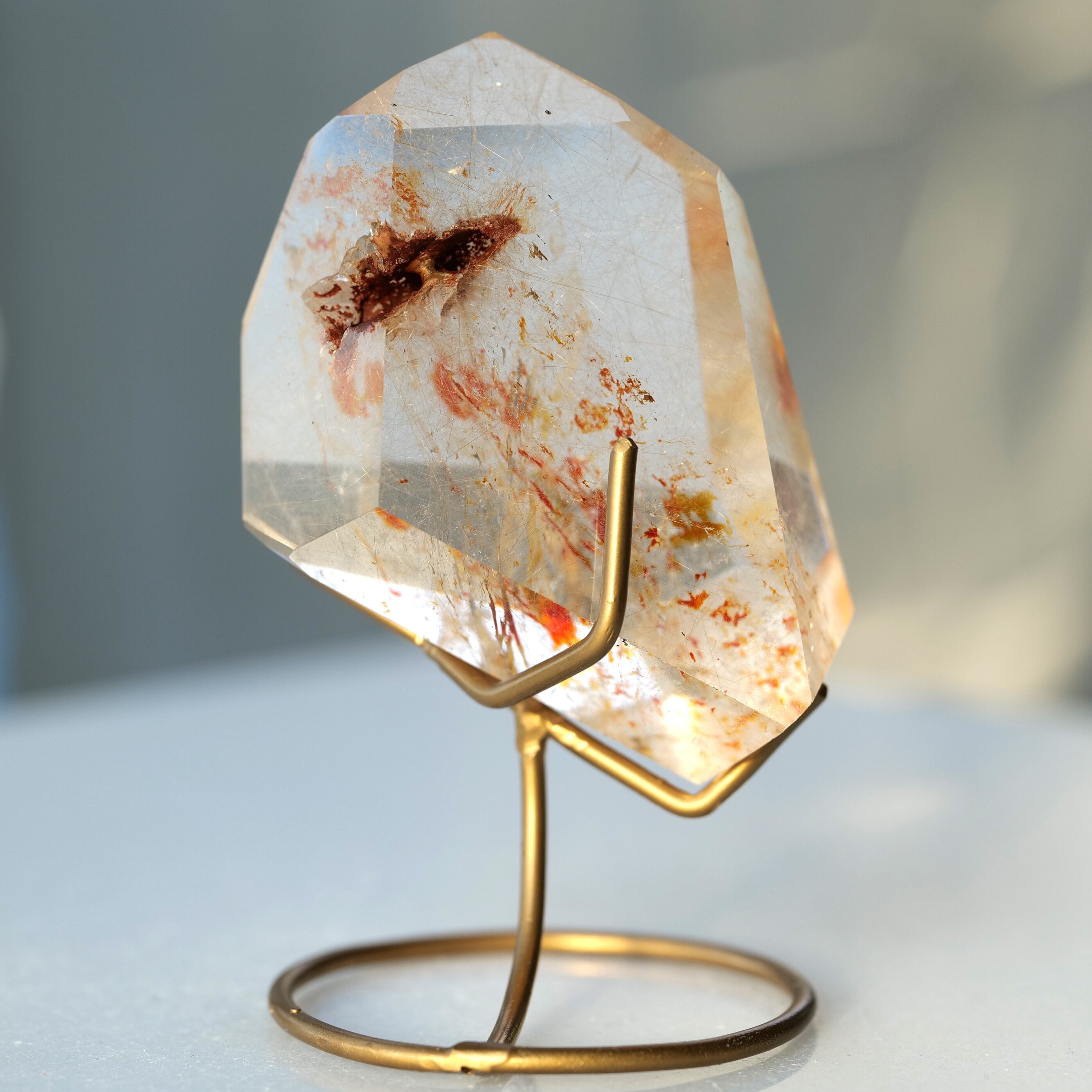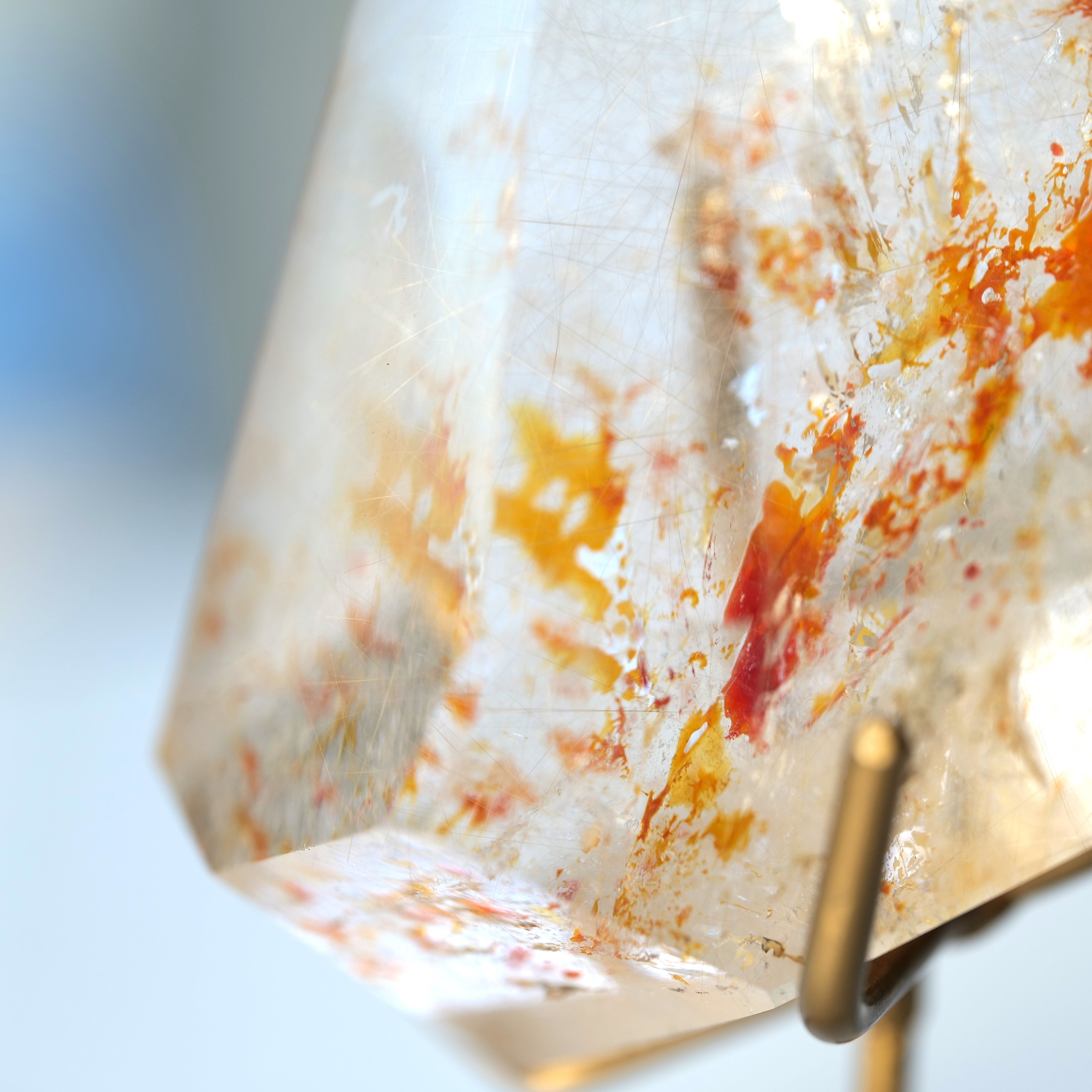 細かいゴールデンルチルが入った水晶に、炎のようなヘマタイトやリモナイトが混じる、奇跡のように美しいオーロラクォーツです。
