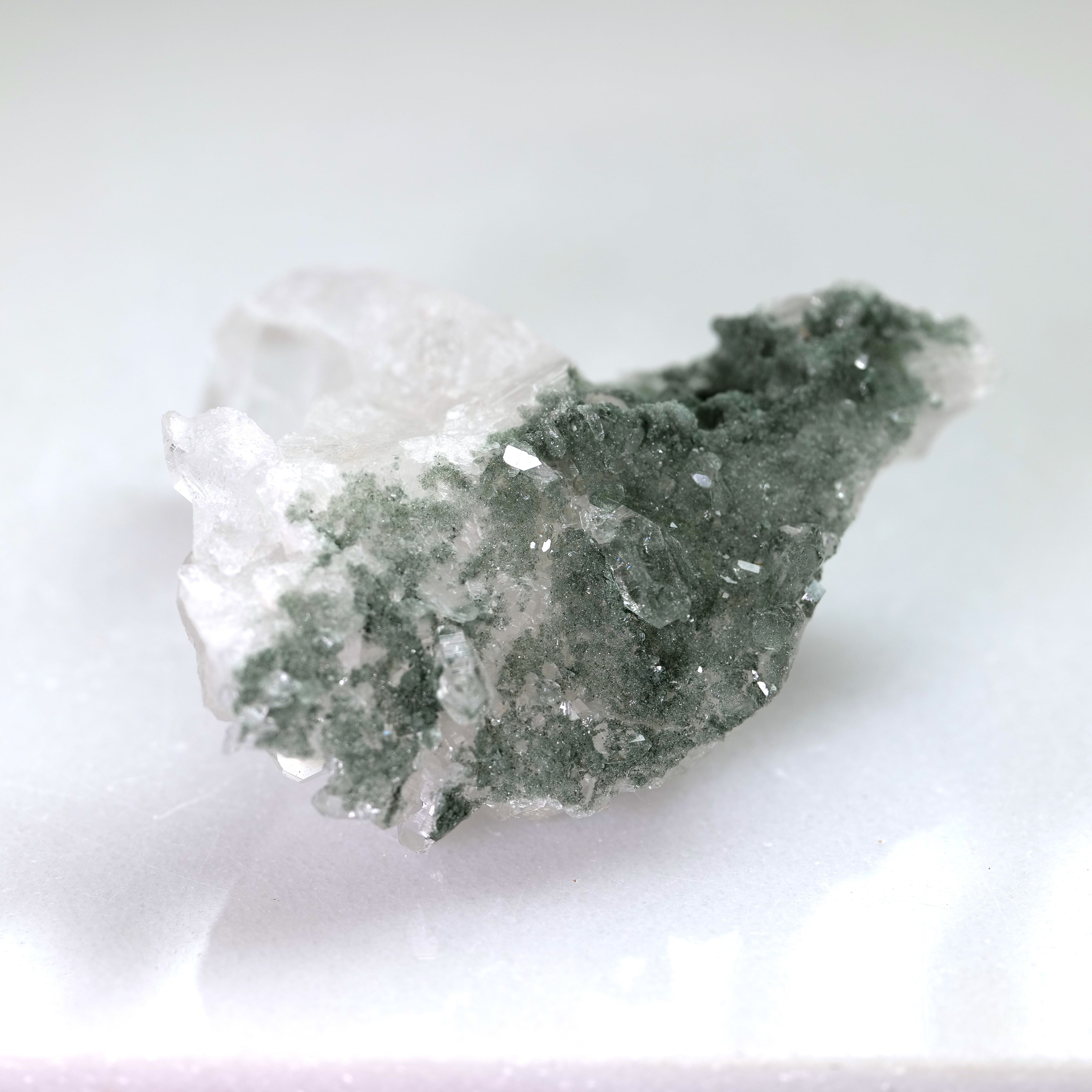 無色透明なものもあれば、ヒマラヤ水晶の特徴でもある緑色のクローライトがついているものがあります。近年この採掘場からクローライトを伴ったルチル水晶が産出しはじめ一躍有名となりました。