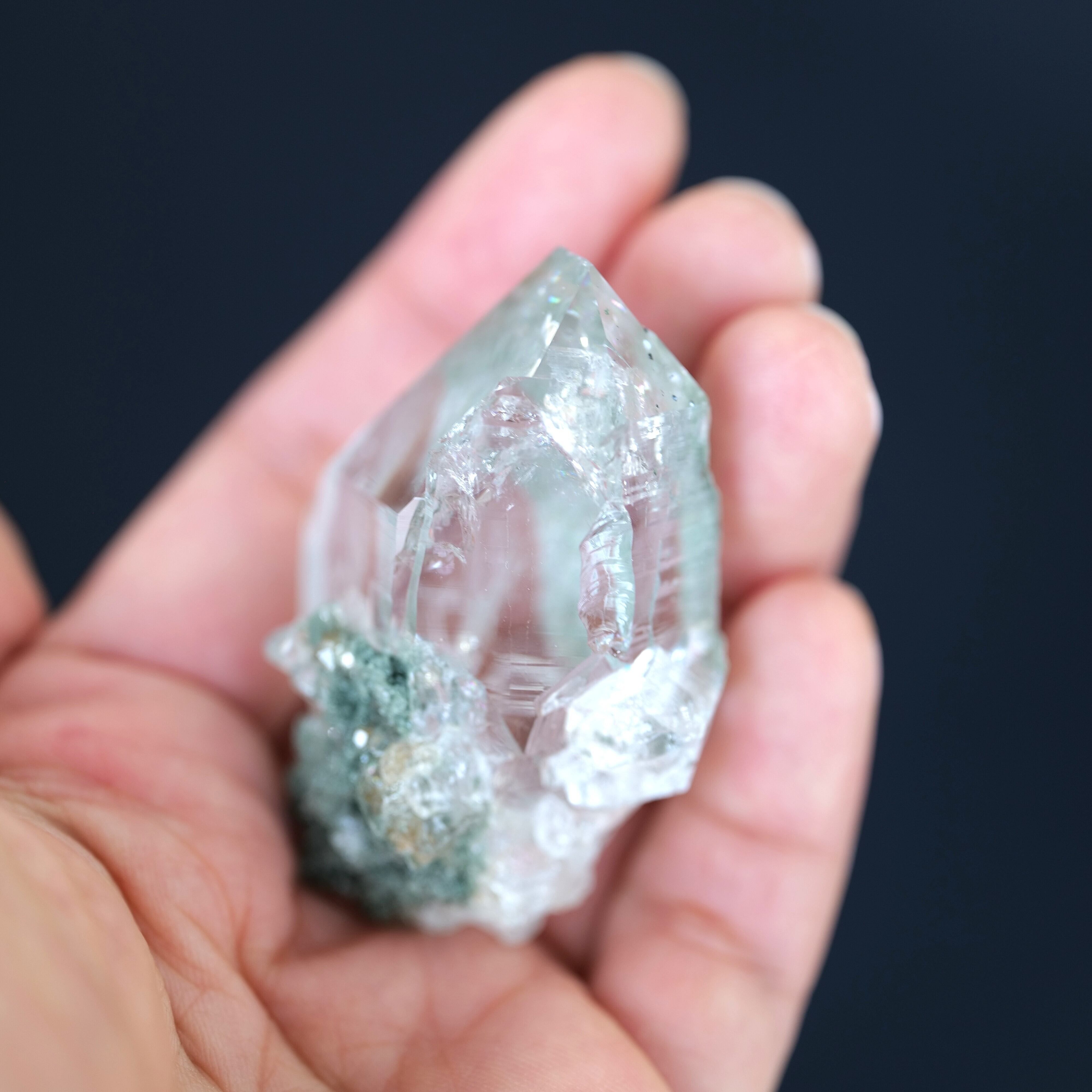 無色透明なものもあれば、ヒマラヤ水晶の特徴でもある緑色のクローライトがついているものがあります。近年この採掘場からクローライトを伴ったルチル水晶が産出しはじめ一躍有名となりました。