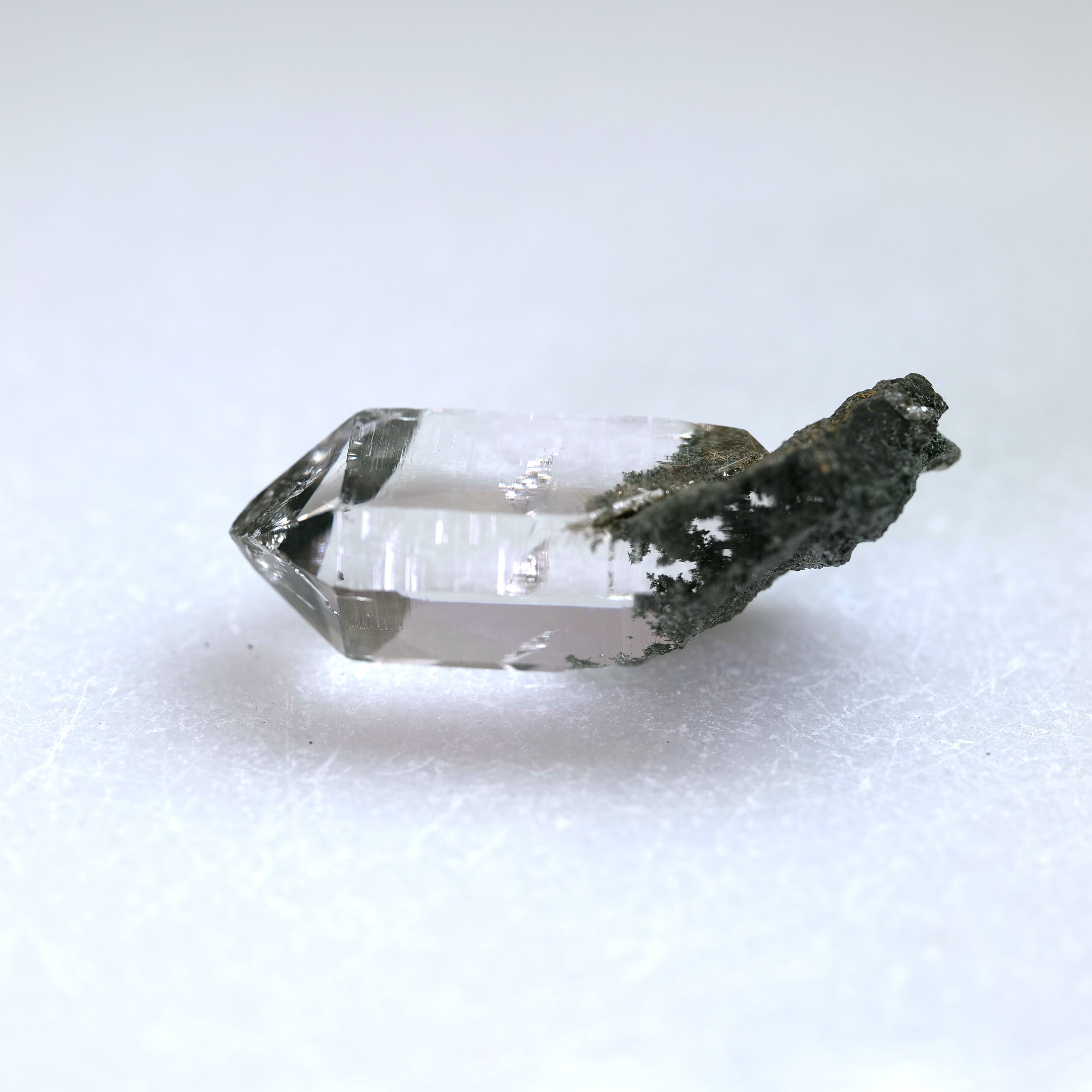 無色透明なものもあれば、ヒマラヤ水晶の特徴でもある緑色のクローライトがついているものがあります。近年この採掘場からクローライトを伴ったルチル水晶が産出しはじめ一躍有名となりました。